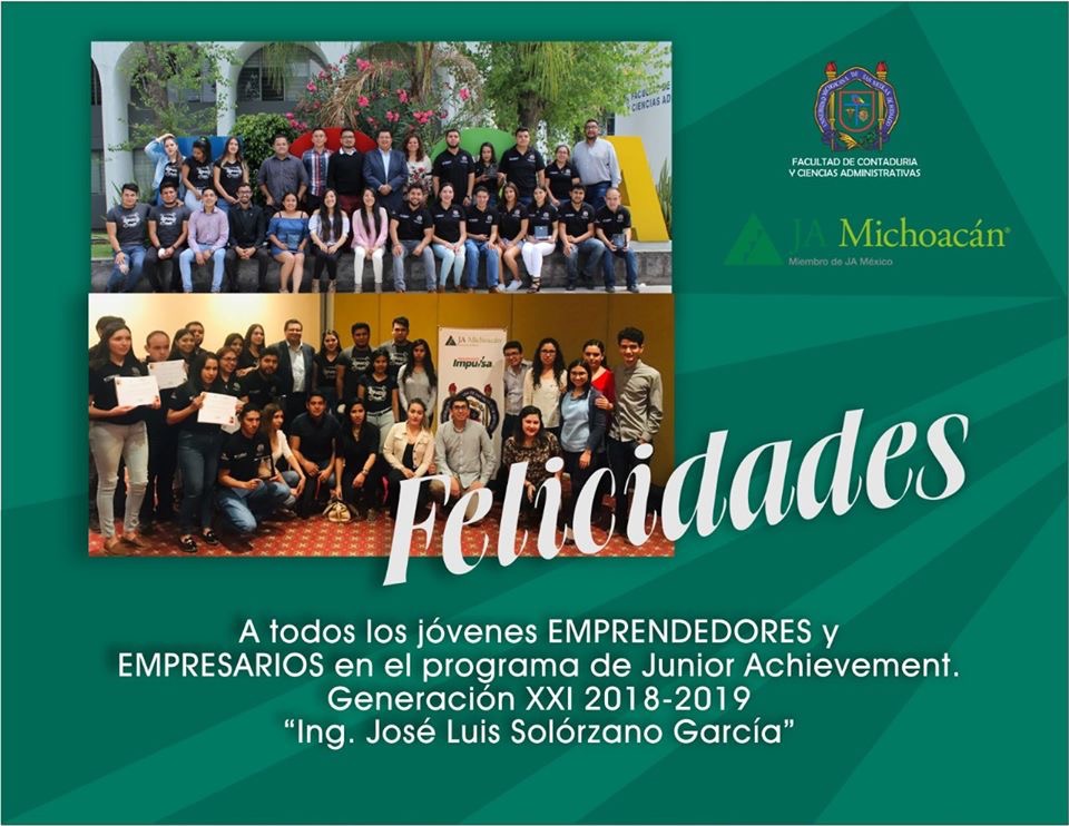 Morelia, Mich. Mayo de 2019.- La Facultad de Contaduría y Ciencias Administrativas de la Universidad Michoacana de San Nicolás de Hidalgo volvió a destacar por sus programas de emprendedurismo implantados, en días pasados logró conquistar cuatro premios estatales en el Programa de Junior Achievement, Generación XXI, 2018-2019, “Ing. José Luis Solórzano García”