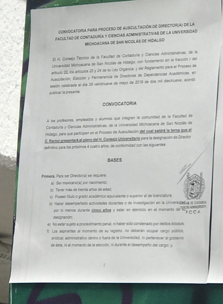 Morelia, Mich. Mayo de 2019.- Esta mañana fue publicada la convocatoria para renovar la Dirección de la Facultad de Contaduría y Ciencias Administrativas de la Universidad Michoacana de San Nicolás de Hidalgo, la que durará cuatro años.