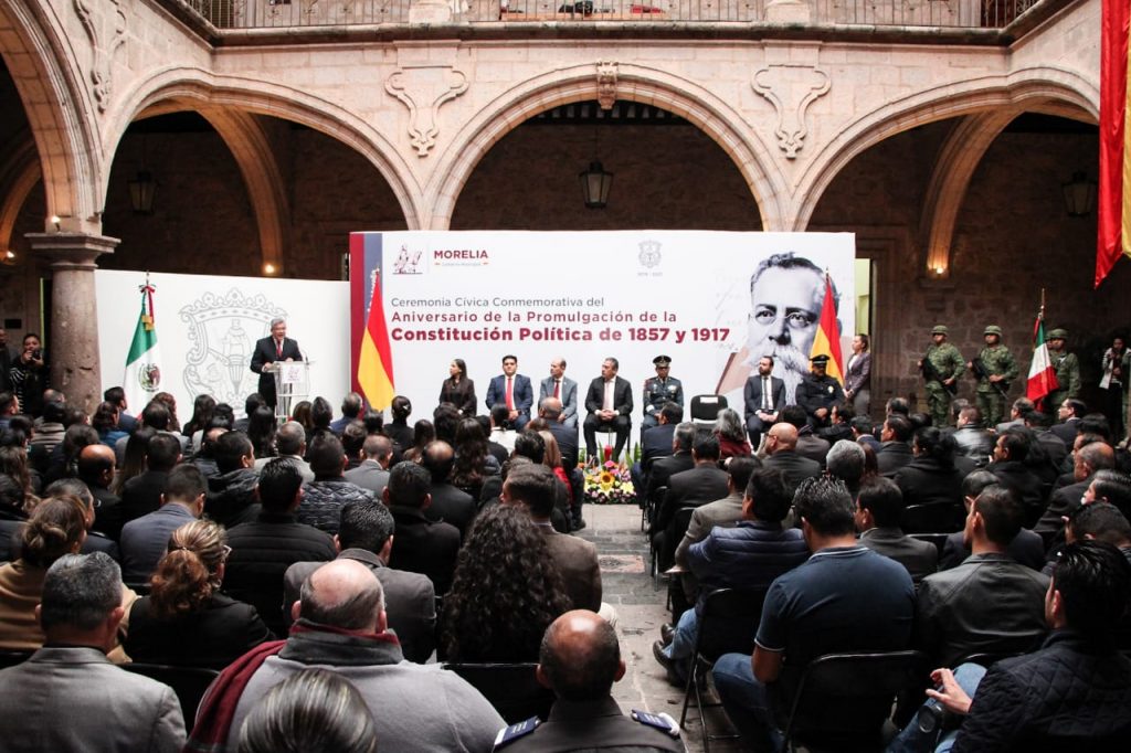 Morelia, Michoacán, 05 de febrero de 2020. El Poder Legislativo local tiene el claro compromiso de fortalecer las Leyes que hoy rigen a Michoacán con base en la Constitución Federal actual que está fundamentada en la expedida en 1917, así lo aseguró el presidente de la Mesa Directiva del Congreso del Estado, Antonio de Jesús Madriz Estrada, durante el acto conmemorativo del aniversario de la promulgación de la Constitución Política de 1857 y 1917.