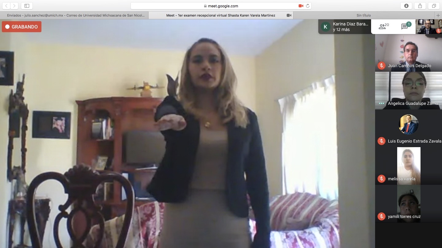 El acto protocolario inició en punto de las 14:00 horas con la conexión en la plataforma virtual Meet de Google donde la sustentante desde la ciudad de Apatzingán, Mich., se vinculó en esta ciudad con los sinodales Presidente, Doctora Angélica Guadalupe Zamudio dela Cruz, Secretario Maestro Juan Campos Delgado y como Vocal el Doctor Julio César Sánchez Bucio,